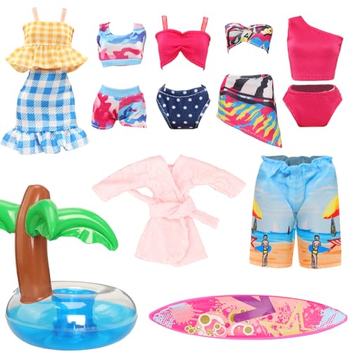 Miunana 9 Kleider Puppenzubehör für Puppen = 1 Badehose + 1 Surfbrett für Jungen Puppen + 1 Strandkleidung + 4 Badeanzug + 1 Bademantel + 1 Rettungsring für...